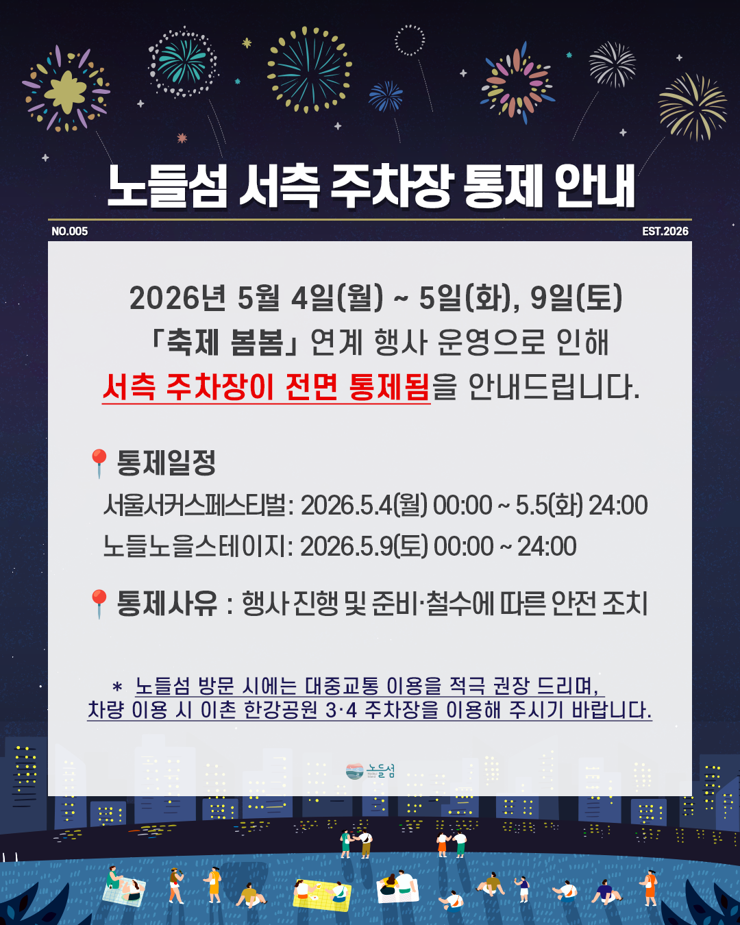 노들섬 서측 주차장 통제 안내(2026.5.4.~5.5, 5.9)