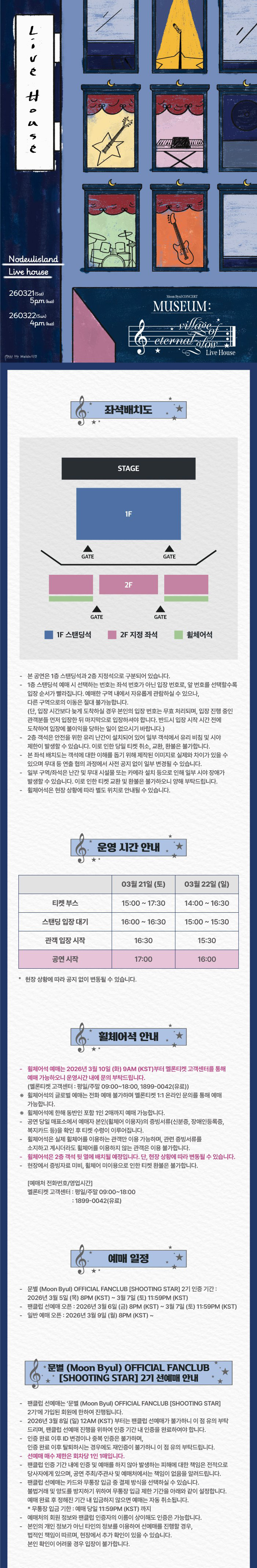 프로그램 문별(Moon Byul) CONCERT[MUSEUM : village of eternal glow – Live] 기간 2026.03.21(토) - 2026.03.22(일) 시간 토 오후 5시 일 오후 4시 장소 라이브하우스 등급 초등학생이상 관람가 예매하기 [예매하기] 클릭 시, 본 공연의 티켓예매를 위하여 각 예매 사이트로 이동합니다. 유사 프로그램 대관공연 D-13 먼데이프로젝트 시즌9[Heart & Friends] 앵콜 콘서트 라이브하우스 2026.03.18 (수) 대관공연 2026 8TURN FAN CONCERT [TURN TABLE : ETERNAL FLAME] 라이브하우스 2026.02.26 (목) 대관공연 2026 CAN’T BE BLUE 단독공연 [PRUSSIAN BLUE] 라이브하우스 2026.02.20 (금) 대관공연 한국 힙합 어워즈 2026 라이브하우스 2026.02.10 (화)