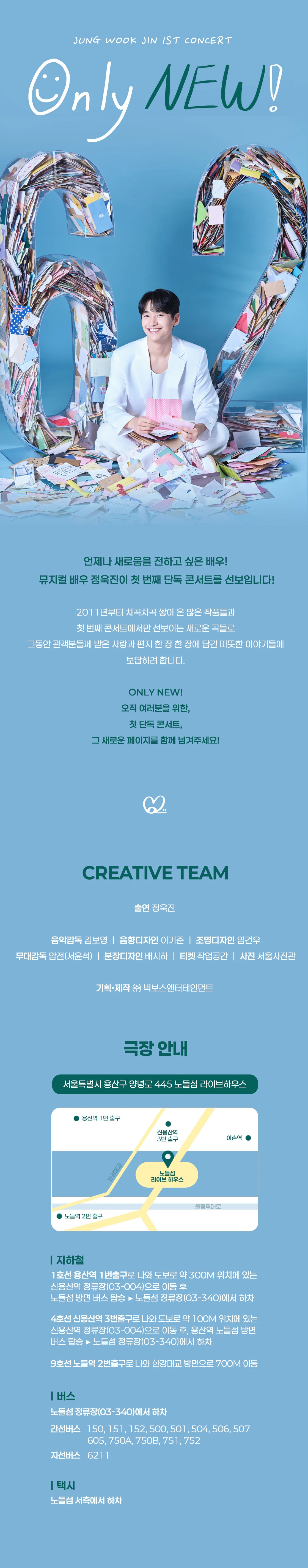 프로그램 정욱진 단독 콘서트 〈Only NEW!〉 기간 2026.04.18(토) - 2026.04.19(일) 시간 토: 오후 7시 일: 오후 6시 장소 라이브하우스 관람시간 120분 등급 전체관람가 가격 Go뉴기석 96,200원 Chill뉴기석 76,200원 예매하기 [예매하기] 클릭 시, 본 공연의 티켓예매를 위하여 각 예매 사이트로 이동합니다. 유사 프로그램 대관전시 성신여자대학교 일반대학원동양화과 전시 〈엉켜버린 끈 푸는 중 —〉 노들갤러리1관 2026.04.20 (월) 대관공연 87DANCE PRESENTS IN SEOUL : #PALCHILLTOWN 라이브하우스 2026.04.24 (금) 기획공연 D-8 2026 노들노을스테이지 노들섬 전역 2026.05.05 (화) 기획공연 D-11 2026 노들노을스테이지 라이브하우스 – Tokai, 주혜린, 프랭클리(FRankly) 라이브하우스 2026.05.08 (금)