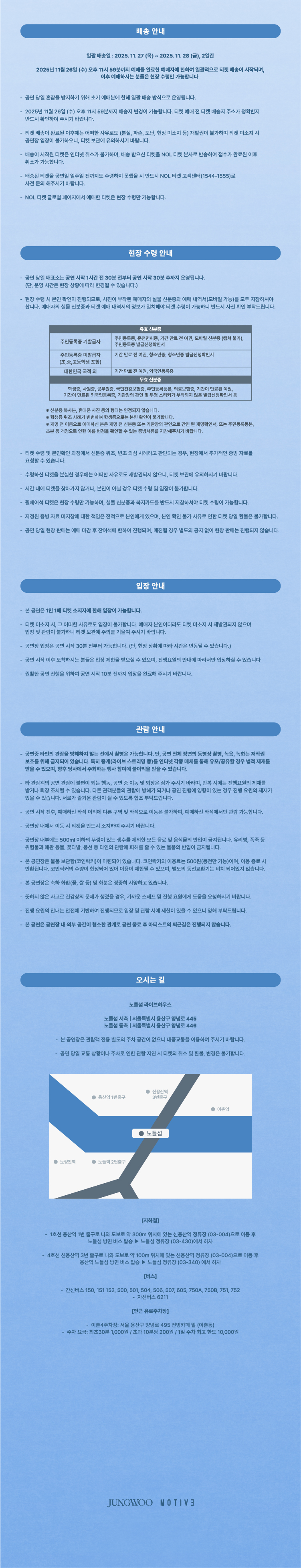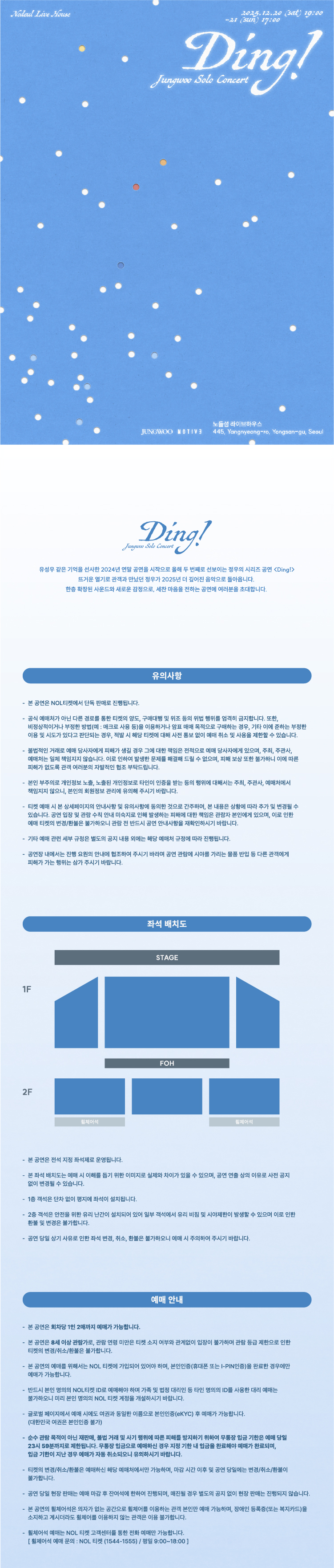 프로그램 2025 정우 단독 공연 〈Ding!〉 기간 2025.12.20(토) - 2025.12.21(일) 시간 토 오후 7시 일 오후 5시 장소 라이브하우스 관람시간 90분 등급 만 8세이상 관람가 가격 전석 88,000원 예매하기 [예매하기] 클릭 시, 본 공연의 티켓예매를 위하여 각 예매 사이트로 이동합니다. 주최/기획 주식회사 모티브스튜디오 고객문의 1544-1555 유사 프로그램 대관전시 경동대학교 디자인학과 21회 졸업전시회〈파도: 반향을 일으키다〉 노들갤러리 2관 2025.11.14 (금) 공동주최공연 2025 서울거리공연 구석구석라이브(11/19~22) 노들스퀘어 2025.11.18 (화) 대관공연 제5회 ㅊㅊ-하다 페스티벌 라이브하우스 2025.11.18 (화) 대관전시 현재 2025 중부대학교 산업디자인학과졸업전시회 〈Mosaic:모자이크〉 노들갤러리 1관 2025.11.19 (수)