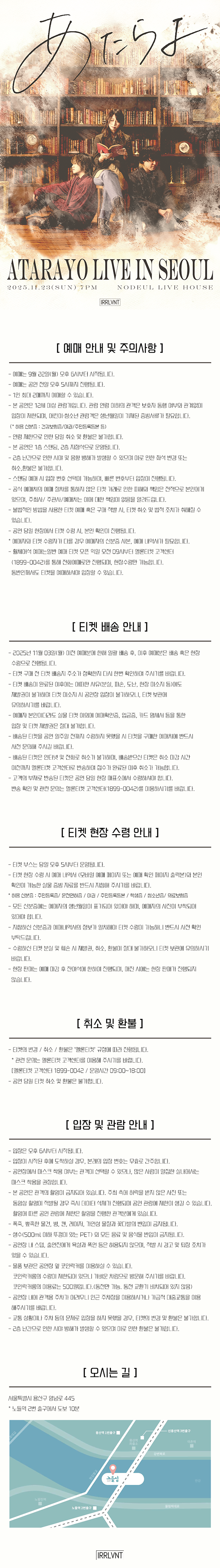 프로그램 Atarayo(아타라요) Yume-gatari TOUR 2025 IN SEOUL 기간 2025.11.23(일) 시간 오후 7시 장소 라이브하우스 관람시간 90분 등급 12세 이상 가격 전석 99,000원 예매하기 [예매하기] 클릭 시, 본 공연의 티켓예매를 위하여 각 예매 사이트로 이동합니다. 유사 프로그램 대관전시 현재 소니 이미지 갤러리 〈ONE AND ONLY〉 노들갤러리 2관 2025.11.04 (화) 대관전시 현재 계원예술대학교 플라워디자인과 졸업전시〈FCL(Flower Creators Lounge)〉 노들갤러리 1관 2025.11.05 (수) 대관공연 세계비즈앤스포츠월드 창간 20주년 기념다문화가정 돕기 희망big콘서트 라이브하우스 2025.11.05 (수) 대관공연 이날치 〈흥보가〉 발매 콘서트 라이브하우스 2025.11.06 (목)