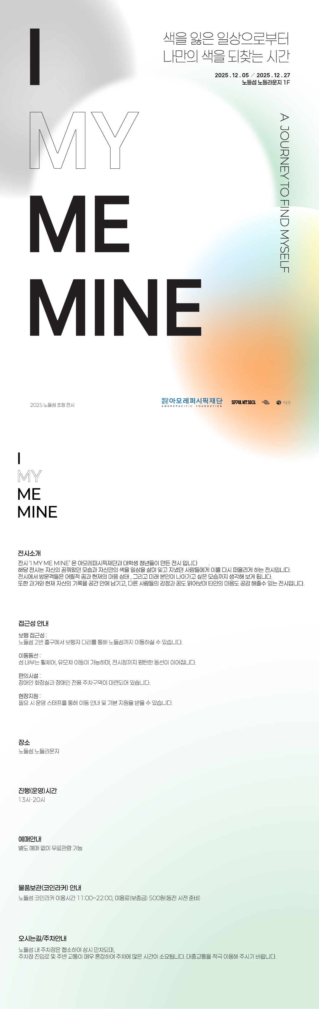 프로그램 2025 노들섬 초청전시 〈I MY ME MINE〉 기간 2025.12.05(금) - 2025.12.27(토)※매주 월요일 휴관 시간 오후 1시 ~ 오후 8시 장소 노들라운지 등급 전체관람가 가격 무료관람 유사 프로그램 대관전시 KAIST 산업디자인과 전시In Transition: Programmable Design 노들갤러리 1관 2025.12.12 (금) 대관전시 순천향대학교 디지털애니메이션학과제22회 졸업전시회〈초록 初錄: 우리의 첫 기록〉 노들갤러리 2관 2025.12.17 (수) 대관전시 우주별 관찰일지: 이야기하는 예술가들 노들갤러리 2관 2025.12.25 (목) 대관전시 한성대학교 인테리어/VMD·전시 디자인제33회 졸업전시회 <𝗗𝗘𝗖𝗢𝗗𝗘 •••- - •••- -> 노들갤러리 2관 2025.12.04 (목)